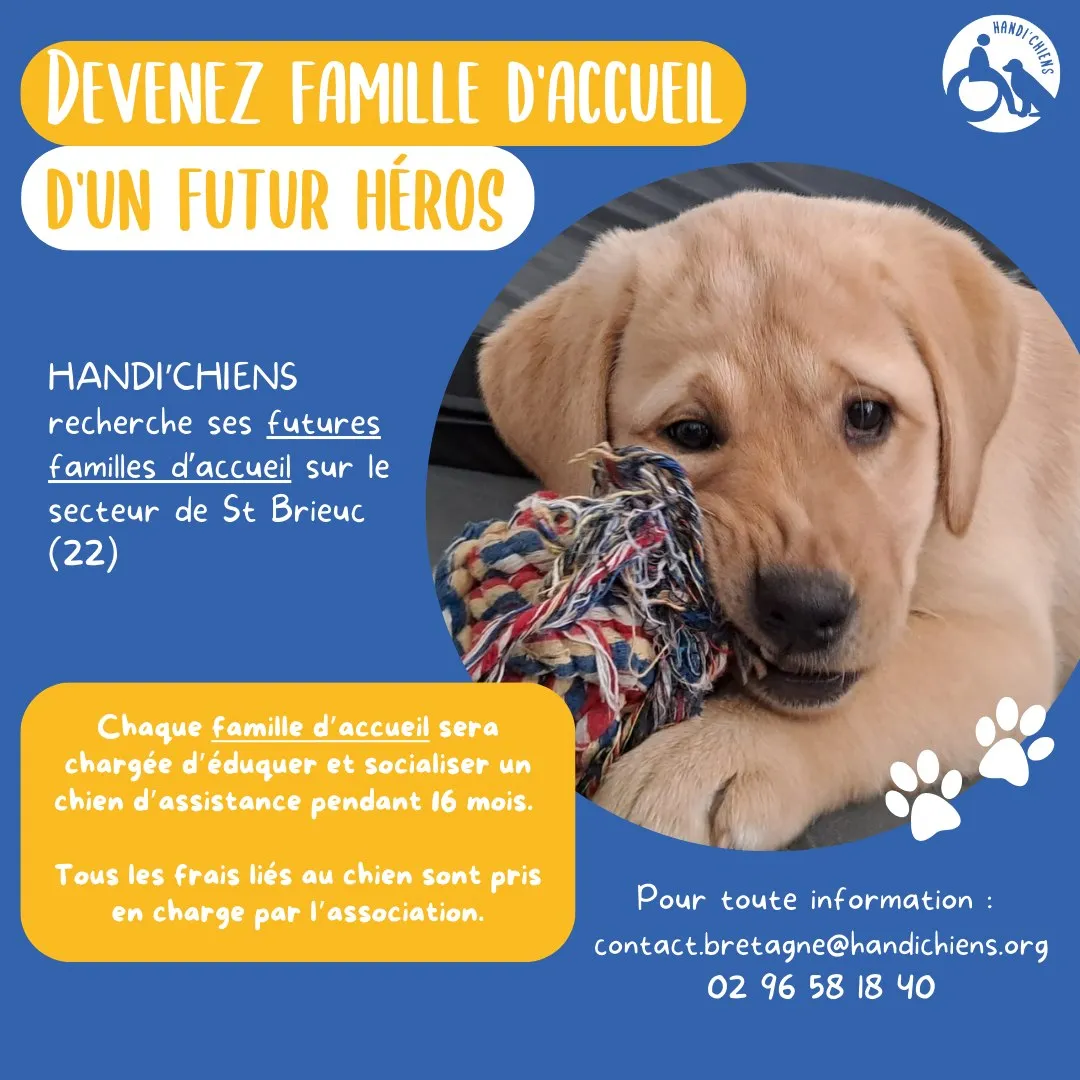 Si vous souhaitez devenir famille d’accueil, retrouvez toutes les infos sur le site handichiens.org ou sur la page Facebook du Centre Handi'Chiens Bretagne.