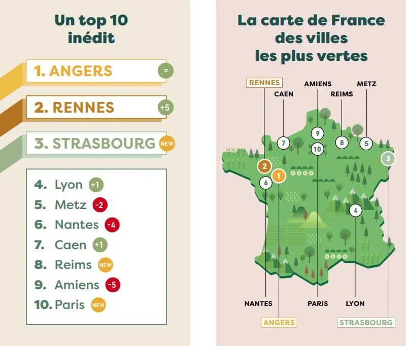 Pour la quatrième fois consécutive, Angers occupe la première place du classement ! La préfecture du Maine-et-Loire devance Rennes, qui gagne cinq places depuis le précédent palmarès en 2020. La ville de Strasbourg se situe quant à elle au pied du podium.