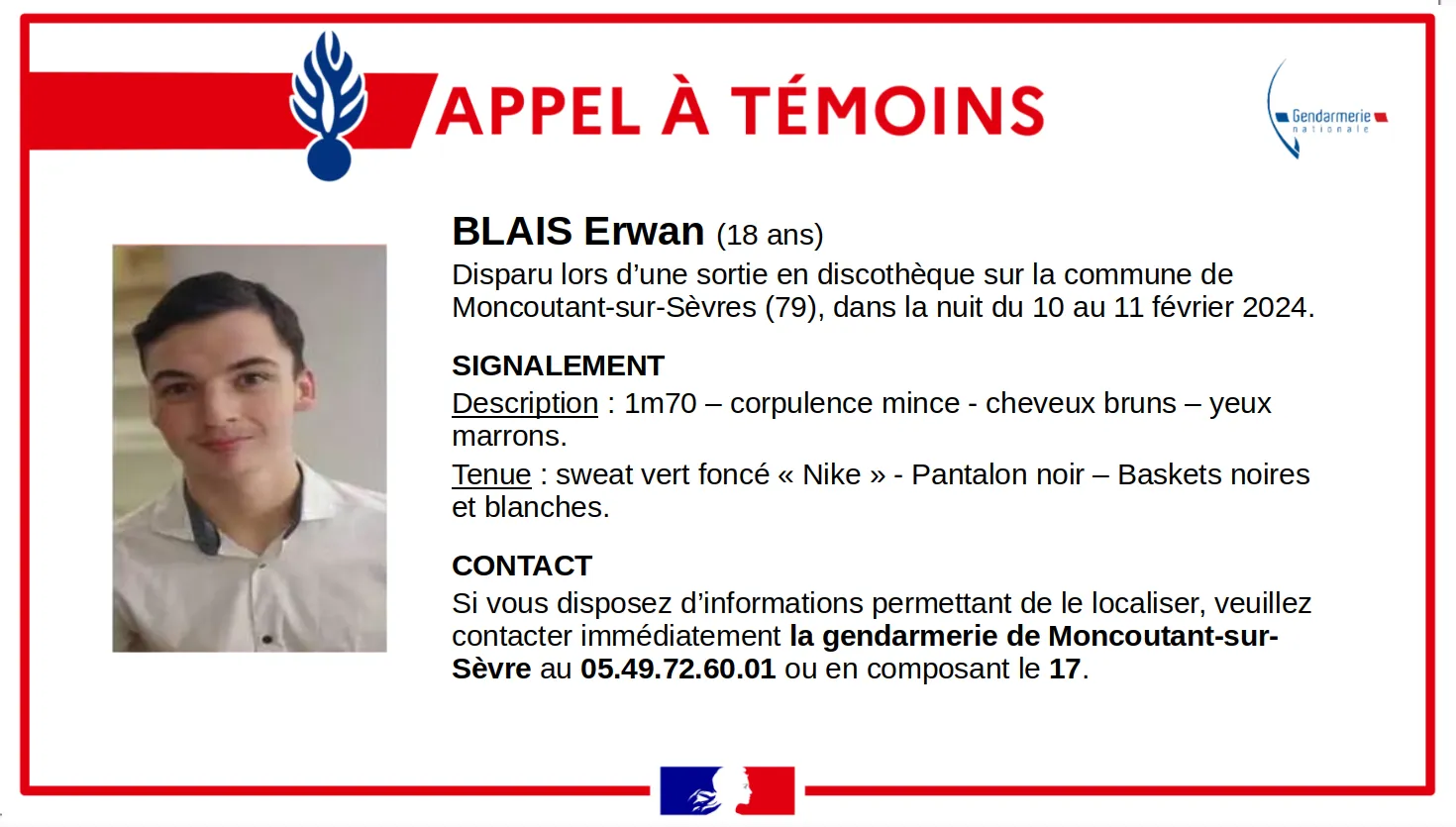 Dans la nuit de samedi 10 à dimanche 11 février, Erwan se trouvait dans la discothèque "La Morinière" à Moncoutant-sur-Sèvre, avec des amis. Le jeune homme a quitté l'établissement seul, à pied, vers 2h30, et n'a ensuite plus donné signe de vie. Il a été vu pour la dernière fois sur le parking de la boîte de nuit.