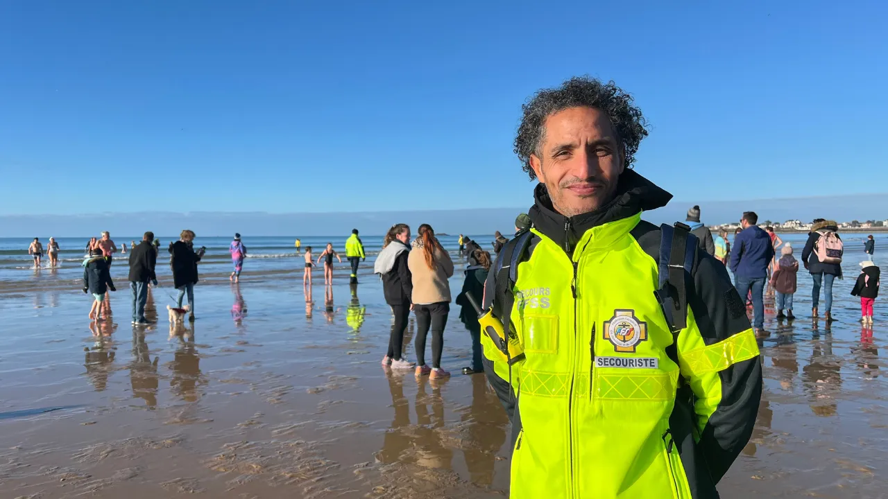 À quelques mètres, Majid Addi ne regarde pas les déguisements. Il observe les visages, les mains, les hésitations. Secouriste bénévole, il encadre l’événement avec son équipe. Dix sauveteurs mobilisés, dont six dans l’eau et quatre sur la plage. Le dispositif est précis. Objectif : intervenir vite, au moindre signal.