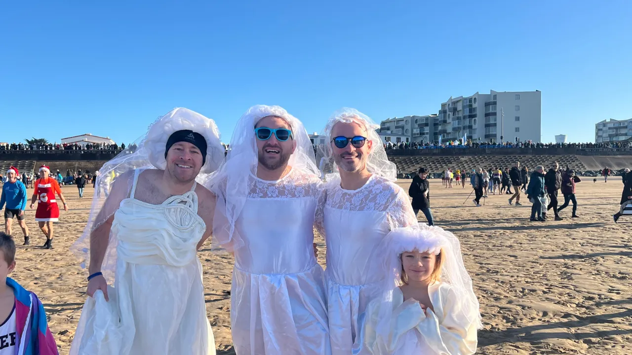 Le bitume brille encore de givre. Il a fallu gratter les pare-brise ce matin du 3 janvier 2026. Mais sur la Grande Plage de Saint-Gilles-Croix-de-Vie c’est un autre décor. Ciel bleu, soleil franc, pas de vent et surtout, une marée de déguisements. Obélix côtoie un homme de Cro-Magnon. Des hommes en robe de mariée croisent des M&M’s. Il y a des perruques, des bonnets, des capes, des combinaisons improbables, de la musique et du vin chaud. À l’heure du grand plongeon, ils sont 1 000 à courir vers l’Atlantique. Température de l'eau : 10 degrés. A leurs côtés, 3 000 personnes sont venues assister à ce spectacle.