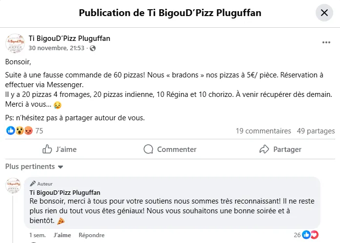 C’est le message diffusé le 30 novembre dernier sur le compte Facebook du Ti BigouD’Pizz, une pizzeria installée dans le Finistère, à Pluguffan.