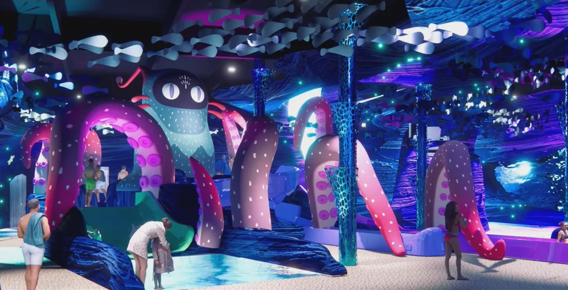 Une nouvelle fois, cet espace abritera des toboggans, mais aussi un labyrinthe aquatique, une grotte musicale ou encore un bassin rempli de jeux idéaux pour les enfants à partir de 3 ans.