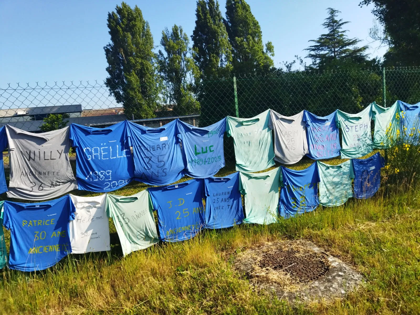 "Gaëlle 1989, Thierry 35 ans..." Accrochés aux grilles, des t-shirts bleus portent les prénoms et l’ancienneté des salariés. Un drap blanc affiche, au feutre noir, un simple mot : "en grève". Ce lundi 26 mai, une trentaine de personnes sont de nouveau rassemblées devant le site de TI Automotive à Nazelles-Négron, pour une énième journée de négociations avec la direction.