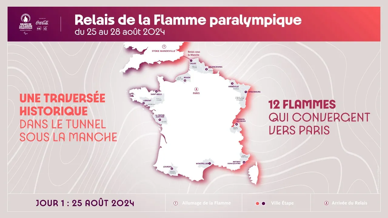 La flamme sera allumée ce samedi 24 août à Stoke Mandeville, en Angleterre, où ont eu lieu les premiers Jeux paralympiques en 1948. Elle traversera le tunnel sous la Manche dès le lendemain, dans les mains de 48 relayeurs (24 Anglais, relayés par 24 Français, à mi-parcours).