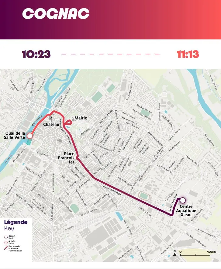 Déjà présente le long du cours d’eau de la Charente, la flamme rejoindra Cognac, terre de création de la célèbre eau-de-vie éponyme, avant de passer par son complexe sportif des Vauzelles jusqu’à 11h23.