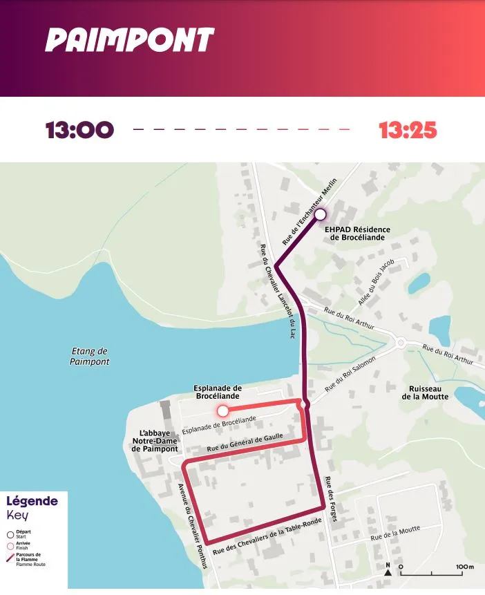 Après une escale dans les villes de Feins (et son Centre Nautique du Domaine de Boulet) à 9h50 ainsi que de Fougères et la majestueuse Tour Mélusine de son château (11h20), la flamme se rendra dans le petit village de Paimpont (13h00), plongé au cœur de la forêt de Brocéliande, emplie de mythes et légendes en tout genre.