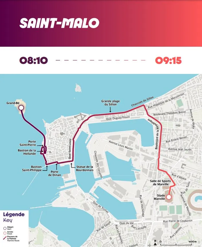 Au grand départ de cette étape (8h10), un voyage dans le temps a été proposé à la flamme olympique. Elle fut plongée au cœur de la Cité des Corsaires dans le cadre de la première escale de la journée, à Saint-Malo.