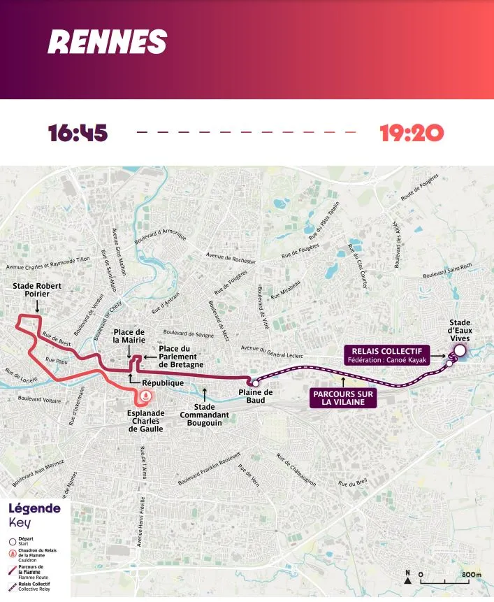 Après un détour par Vitré (14h40) et la commune de Saint-Just (16h15), la flamme atteindra son objectif final du jour : Rennes.