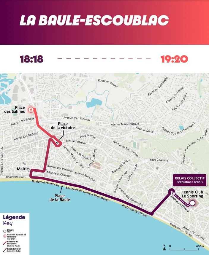 Après un passage par la cité de Vertou (11h50), connue pour ses nombreux chemins de randonnée et de balades en plein air, la flamme fera escale à Vallons-de-l’Erdre (13h16), Basse-Goulaine (14h49) et Ligné (16h28) avant de se diriger vers son objectif final : La Baule-Escoublac.