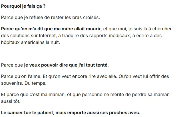 La seule lueur d'espoir se trouve aux États-Unis, où il existe un essai clinique expérimental dans un centre spécialisé. Il s'agit d'une immunothérapie avancée, ce qui pourrait endormir la tumeur, la ralentir afin d'offrir plusieurs mois ou même d'années de vie à sa maman.