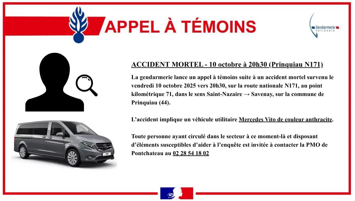 La gendarmerie de Pontchâteau a lancé un appel à témoins pour retrouver le conducteur ou la conductrice d'un Mercedes Vito gris anthracite suspecté d'être impliqué dans l'accident.