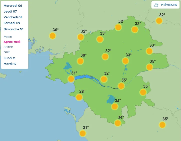 La journée la plus chaude de la semaine s'annonce être celle du dimanche 10 août, avec jusqu'à 36 degrés de maximale à Nantes, Ancenis et Vallet. On aura même 38 le lundi 11.