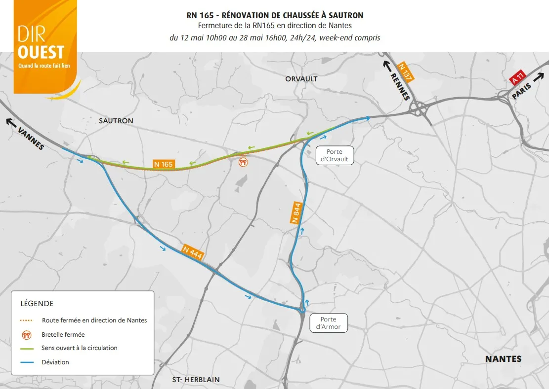 43 jours de travaux sur la RN165. C'est ce qu'annonce la Direction interdépartementale des routes (DIR) Ouest à hauteur de Sautron, avec d'importantes perturbations à prévoir. Car le chantier va nécessiter la fermeture de la RN165 dans chaque sens de circulation. Il débute donc ce lundi 12 mai et s'étend jusqu'au 28 mai dans le sens Vannes / Nantes. Des déviations sont mises en place par la porte d'Armor comme l'indique le plan ci-dessous :