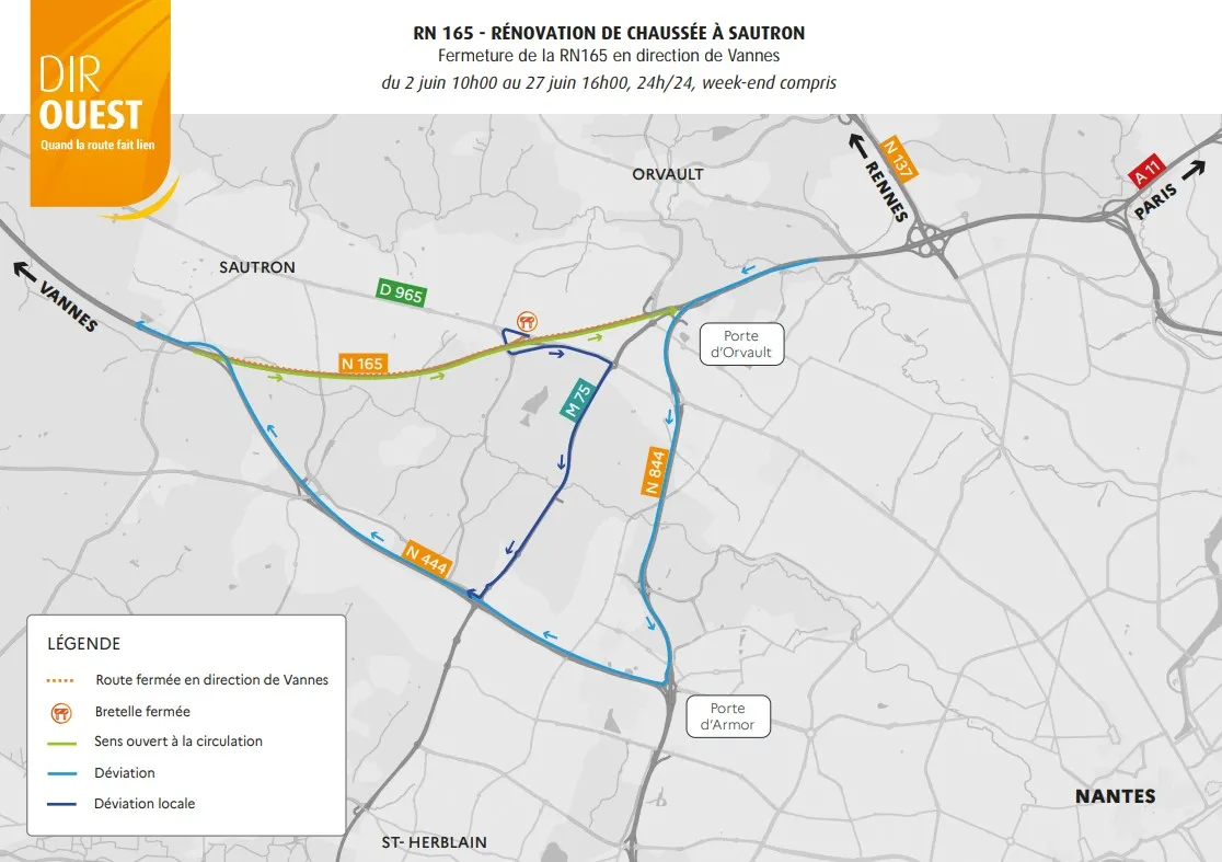Il n'y aura pas de travaux pour l'Ascension. Ils reprendront donc le 2 juin pour se terminer le 27 juin avec une fermeture de la RN165 dans le sens Nantes / Vannes comme l'indique le plan ci-dessous :