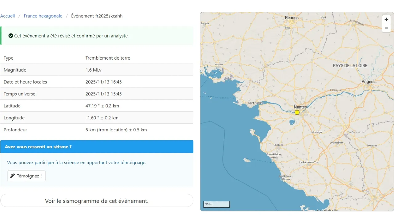 Un grondement voire une vibration a été ressenti à Nantes et ses alentours dans l'après-midi de ce jeudi 13 novembre. Il s'agit d'un léger tremblement de terre.