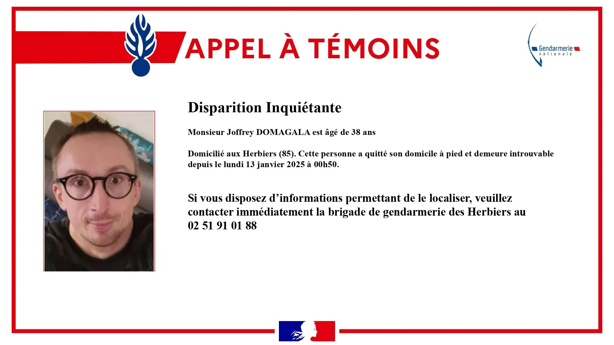 La gendarmerie de Vendée lance un appel à témoins après la disparition d'un homme de 38 ans sur la commune des Herbiers.