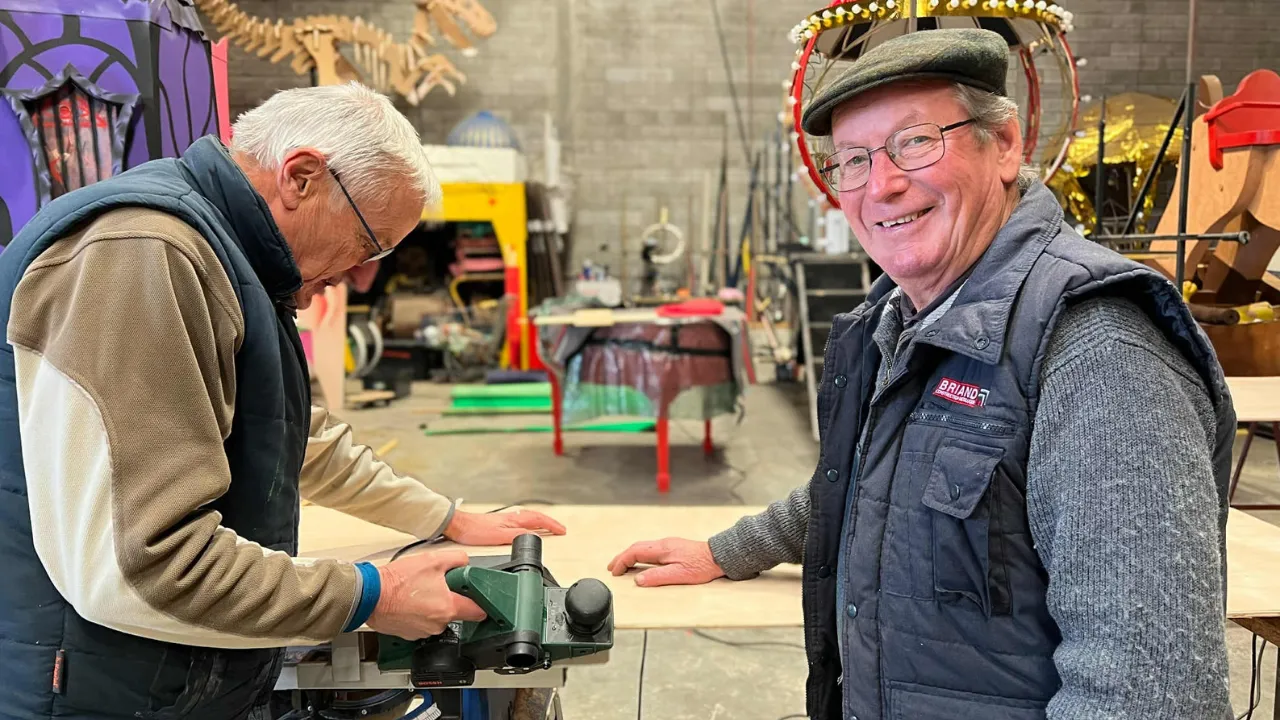 À ses côtés, André. Ancien ébéniste, il fabrique cette année le char des confiseries : "comme son nom l'indique... sucres d'orge, couleurs..." dit-il, concentré. Puis il relève la tête :